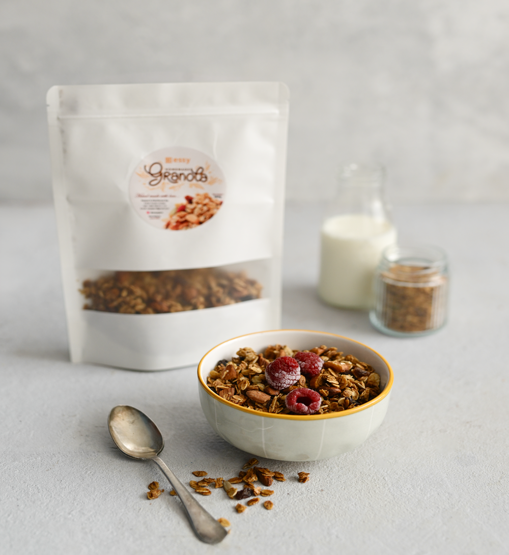 A healthy snack of oats, raisings, almond nuts, sunflower seeds and honey